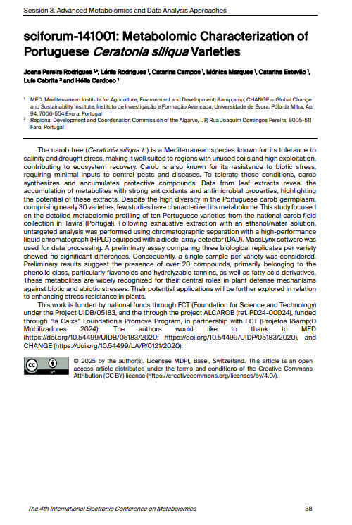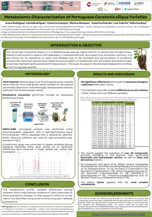 Póster apresentado na Conferência “4th International Electronic Conference on Metabolomics” (13-15 Outubro 2025) pela aluna do Mestrado em Engenharia Agronómica, Joana Rodrigues.